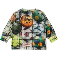 Eloy is a baby top with a print of colourful footballs behind a net. Eloy has easy snap closure on one shoulder.