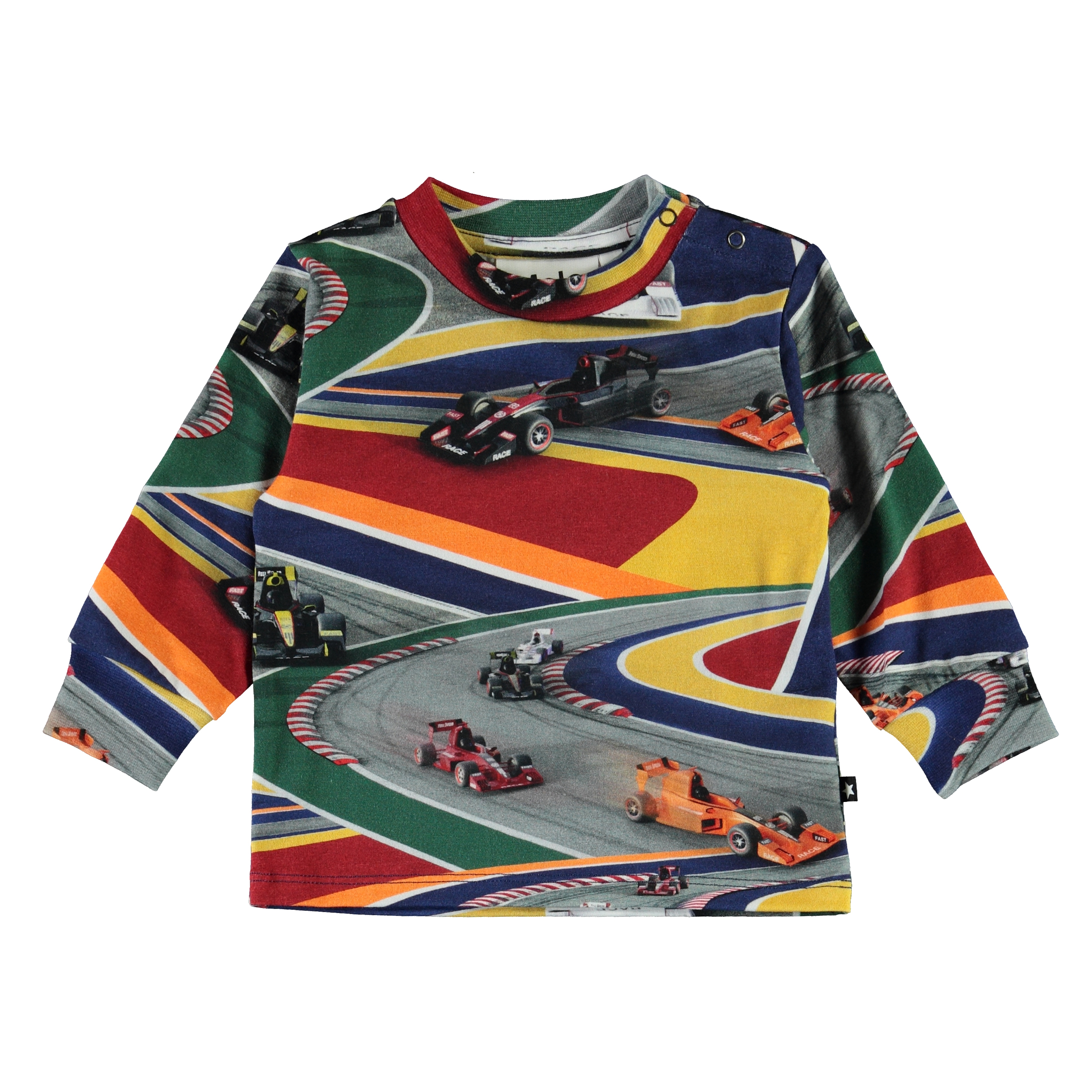 Eloy is a baby top with a print of colourful race cars. Eloy has a snap closure on one shoulder and blue sleeves and back.