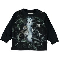 Eloy is a baby top with a print of jungle animals in the dark. Eloy has a snap closure on one shoulder and blue sleeves and back.