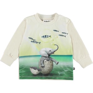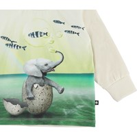 Eloy is a cream coloured baby top with a cool, surrealistic print of a baby elephant bull in an eggshell with fish swimming around. Eloy has an easy snap closure on one shoulder.