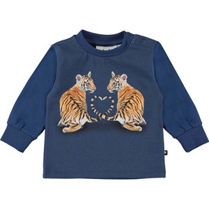 Eloy is a dark blue baby top with a sweet print of small tiger cubs that have used their tails to form a heart. Eloy has an easy snap closure on one shoulder.