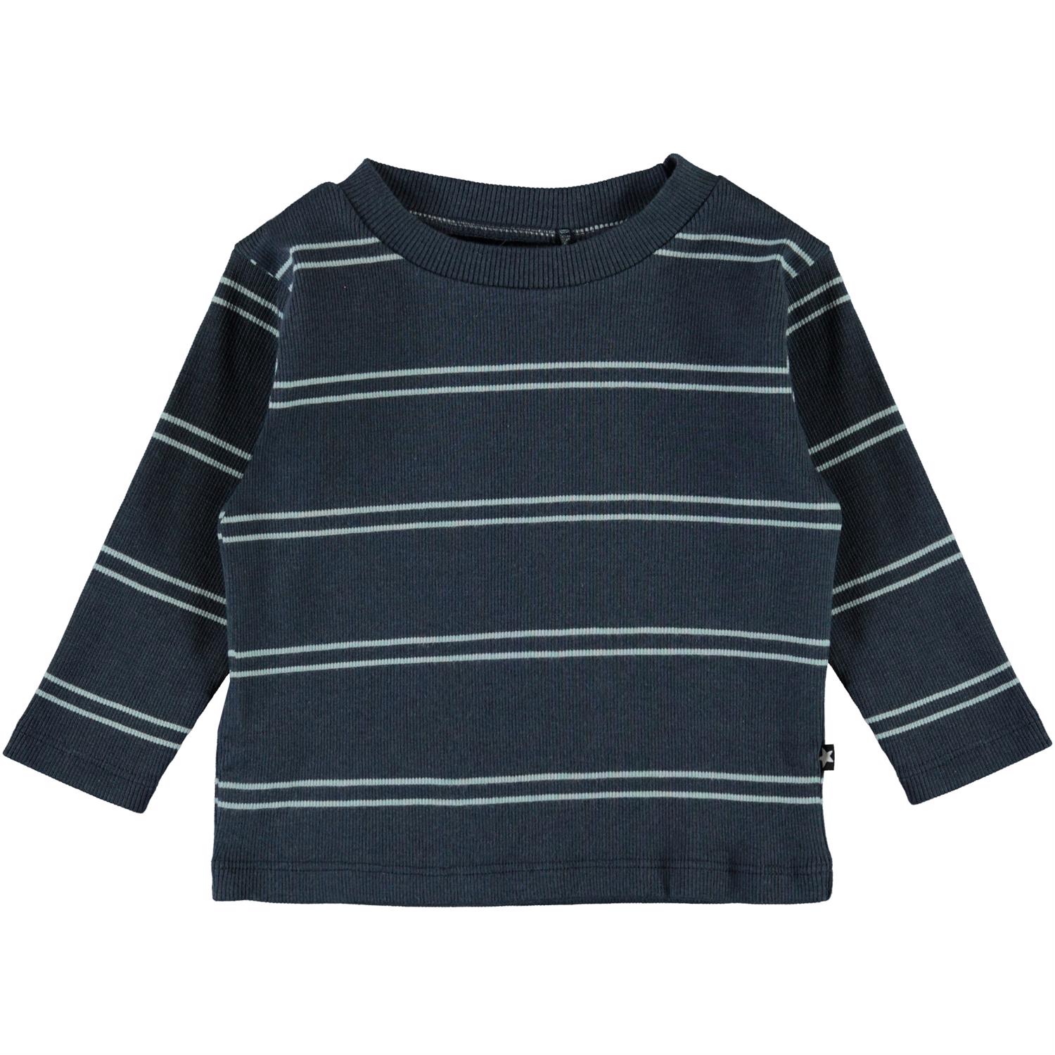 Elvo is a blue striped baby top with long sleeves.