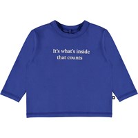 "It's what's inside that counts" is the print on the front of this blue baby sweatshirt. Slip on this sweatshirt because it is the inside that counts.