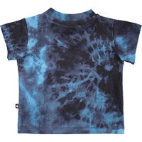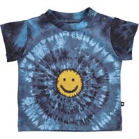 Short sleeve tie dye baby t-shirt in shades of blue with a yellow smiley face on the stomach. The t-shirt has an easy snap closure at the neck.