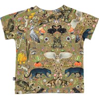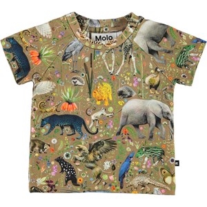 Emmett is a light brown baby t-shirt with a fantastic, detailed print of surrealistic animals and plants. The t-shirt has an easy, single snap closure at the neck..