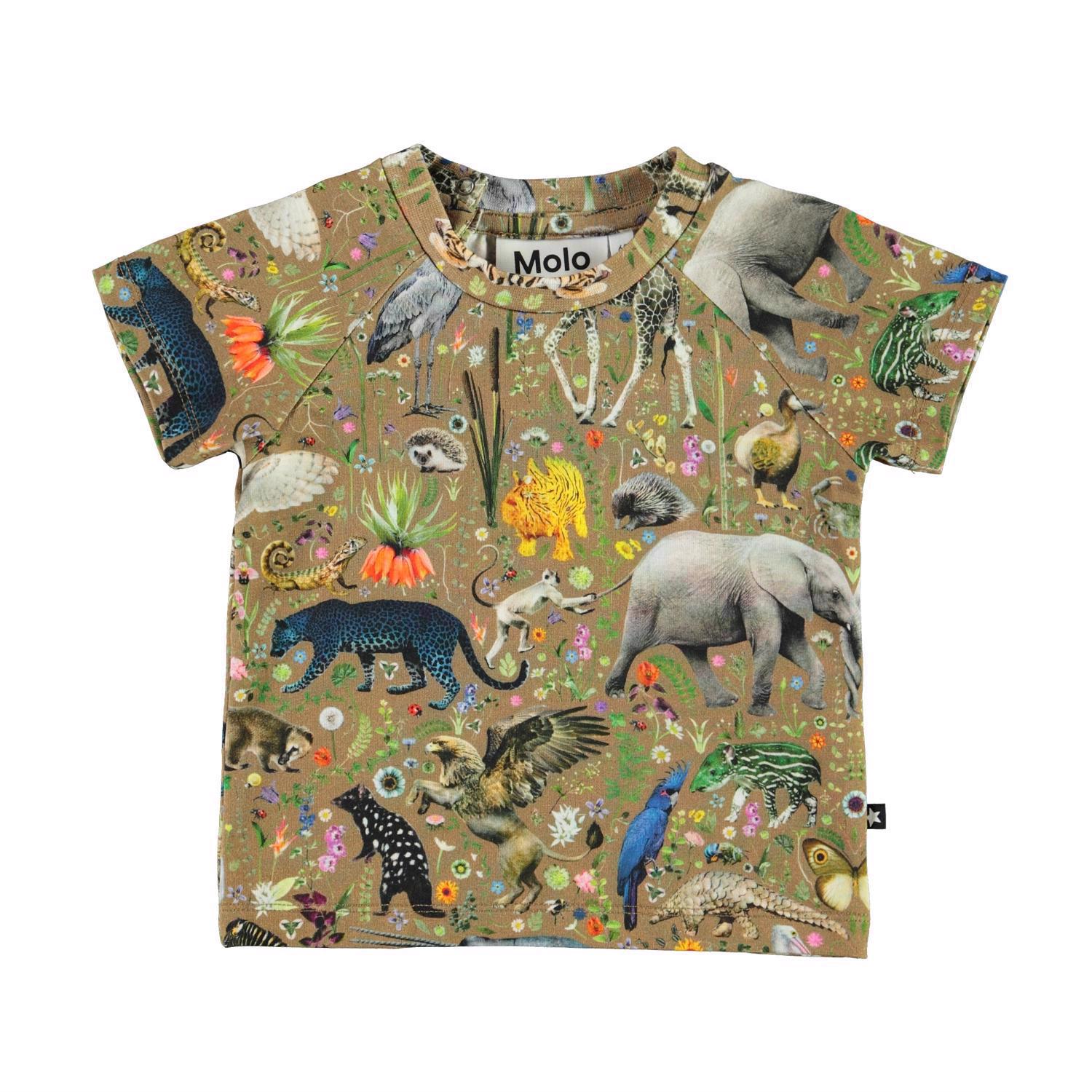 Emmett is a light brown baby t-shirt with a fantastic, detailed print of surrealistic animals and plants. The t-shirt has an easy, single snap closure at the neck..