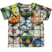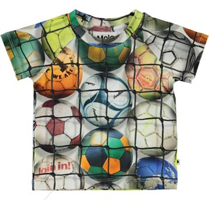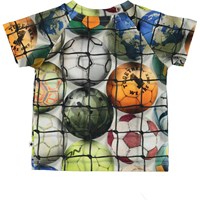 Emmett is a cotton baby t-shirt with a print of colourful footballs behind a net. Emmett has a easy single snap closure at the neck.