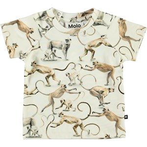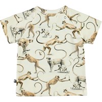 Emmett is a light coloured baby t-shirt with a print of monkeys and their babies that are forming a heart with their tails. The t-shirt has an easy, single snap closure at the neck.