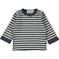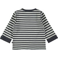 Striped cotton baby top with roll up sleeves. It has an easy snap closure at the neck.