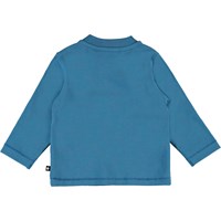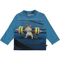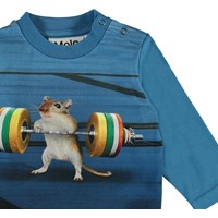 Enovan is a lightblue baby top with a print of a small, strong mouse. Enovan has a snap closure on one shoulder and with dark blue sleeves and back.