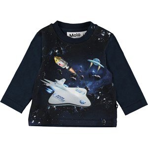 Enovan is a baby top with 'Space Scenario' on the front. Enovan has a button closure on one shoulder and dark blue sleeves and back.