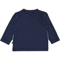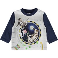 It is hard to stay grounded when the dogs have taken a trip into space on the Enovan top. Enovan has a button closure on one shoulder and dark blue sleeves and back.