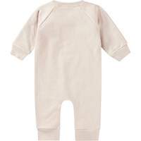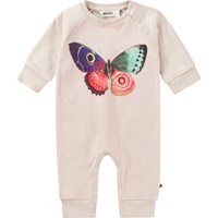 Off-white baby romper in soft organic cotton with long sleeves and legs. The romper has poppers on one shoulder and between the legs, making it easy to take off and put on. It is loose-fitting and has ribbed cuffs on the sleeves and legs, making it comfortable to wear and allowing plenty of freedom of movement. On the front there is a beautiful butterfly print in vibrant colours.