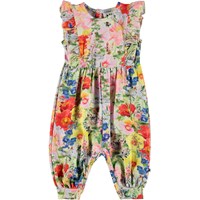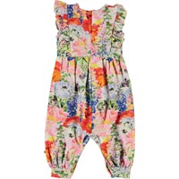 Fallon is a sleeveless baby romper with ruffles at the shoulders. The romper has a print of various animals hiding in the floral print. It has easy snap closure at the neck and crotch.