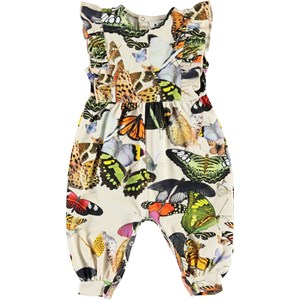 Fallon is a baby suit with long legs with an all-over print of a kaleidoscope of butterflies. The suit has ruffle edges at the armholes and an easy snap closure at the neck and crotch.