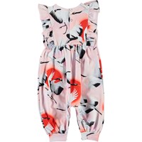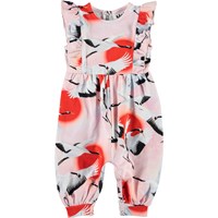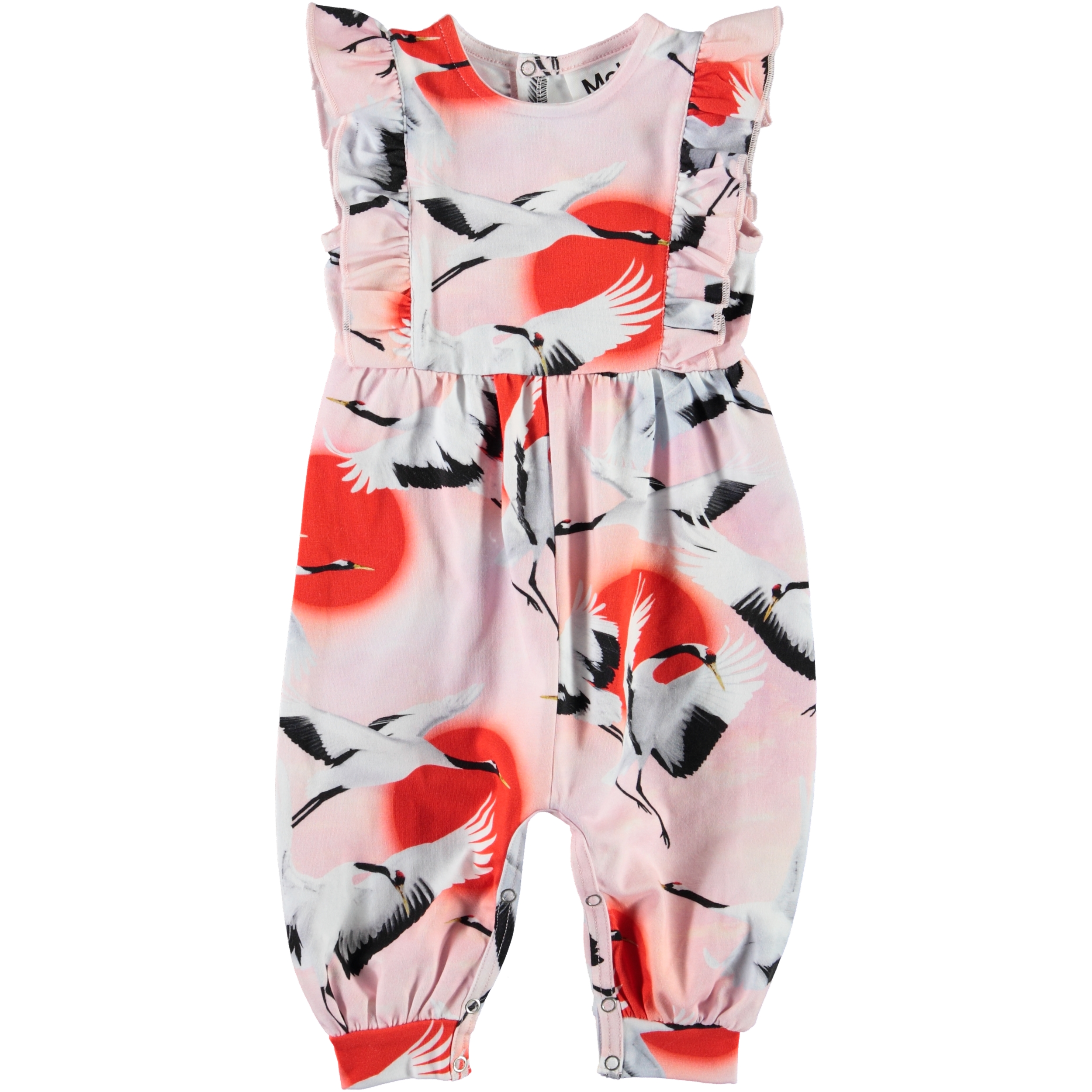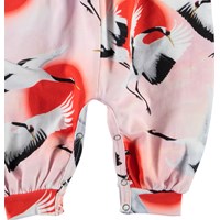 Fallon is a sleeveless baby romper with long legs in pink with a print of flying cranes. The Fallon romper has ruffle details on the front. It has easy snap closure at the neck and crotch.