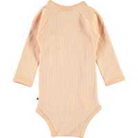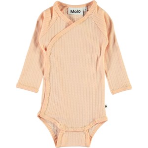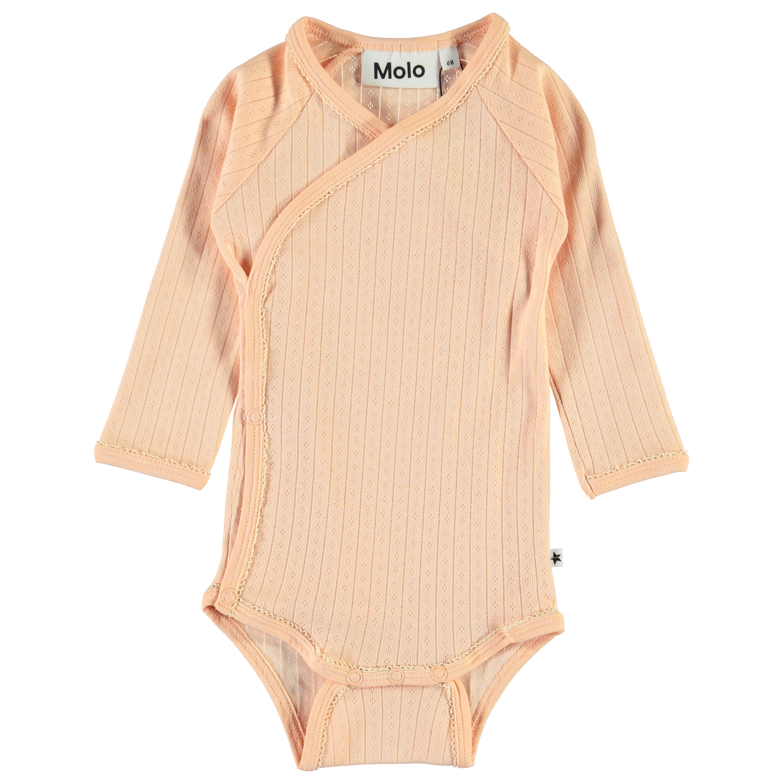 Faye is a coral-coloured, baby bodysuit with a lovely needle-out pattern and long sleeves. It has a slanted snap closure across the front and an easy snap closure at the crotch.
