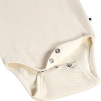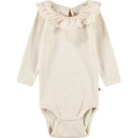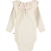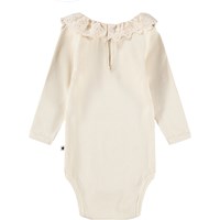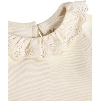 Long-sleeved bodysuit for the little ones made of white organic cotton rib. It has a ruffle collar with broderie anglaise and snap buttons on the shoulders and between the legs for easy dressing and undressing.