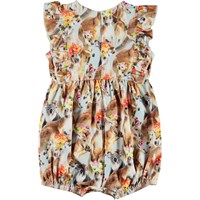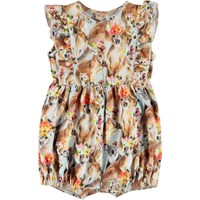 Felicia is a baby suit with a print of kangaroos with flowers on their heads. The suit has ruffle edges at the armholes and an easy snap closure at the neck and crotch.