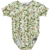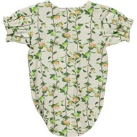Fie is a baby romper with short sleeves in 100% organic cotton jersey. Fie has elastic at the sleeves that creates a lovely ruffle effect. The legs also have elastic so the romper sits snuggly around the leg and keeps the nappy in. Fie is in the Apples Mini all over print, which has branches of an apple tree with lots of apples. The romper has an easy snap closure between the legs.