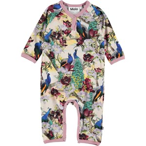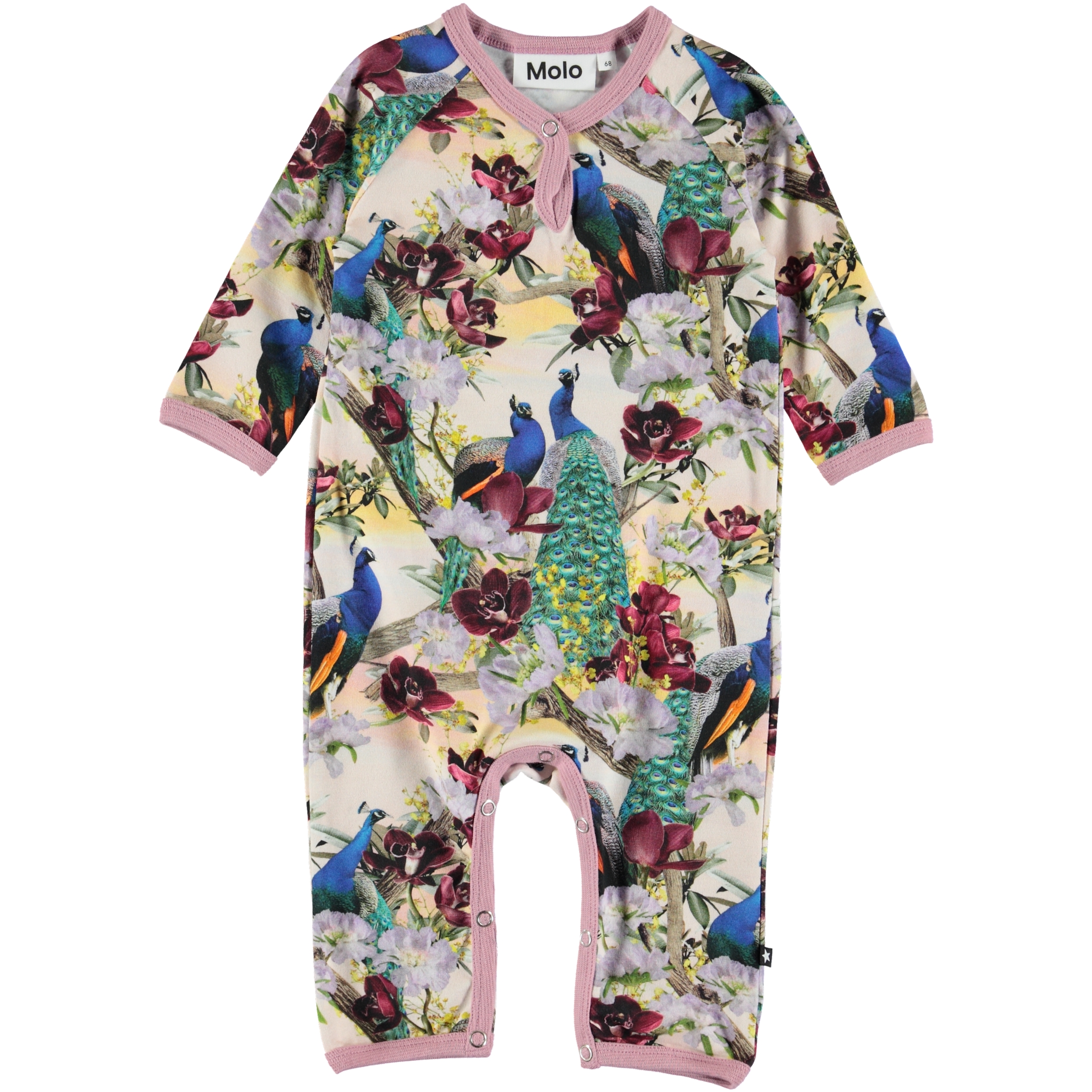 Fiona is a baby romper in the 'Oriental Peacocks' print with a pink edge tape. It has easy snap closure at the neck and crotch.