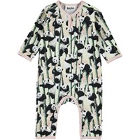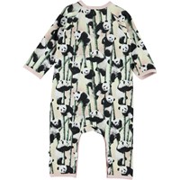 Fiona is a baby romper with an all-over print of panda bears and their favourite food: bamboo. The romper has long sleeves and legs, a pink edge tape and snaps at the neck and crotch.
