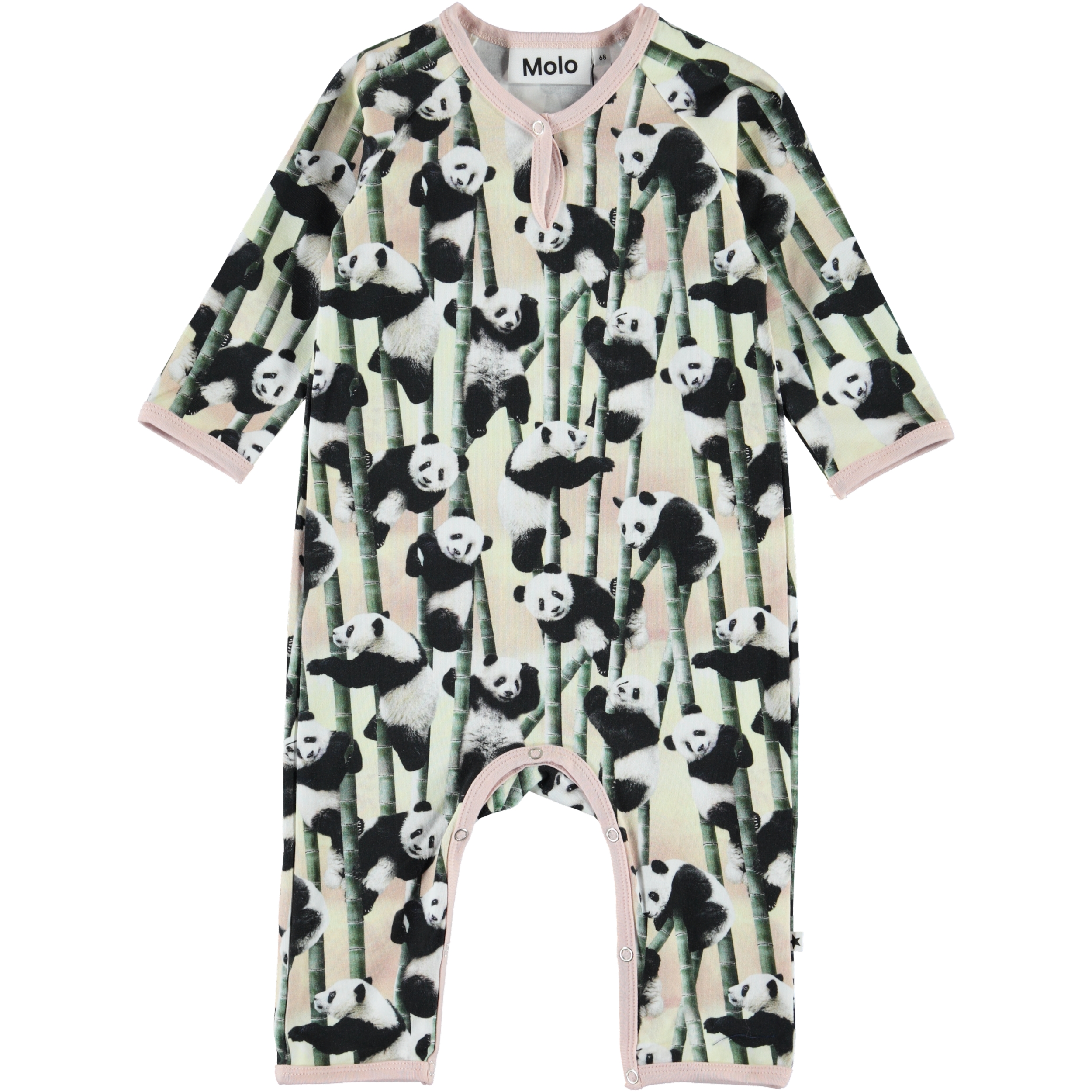 Fiona is a baby romper with an all-over print of panda bears and their favourite food: bamboo. The romper has long sleeves and legs, a pink edge tape and snaps at the neck and crotch.