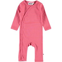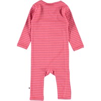 Flora is a baby romper with long sleeves and legs in pink rib with red stripes. The romper has a slanted snap closure on the front and an easy snap closure at the crotch.