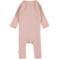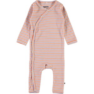 Flora is a purple, rose and red striped baby romper in a lovely needle-out pattern with long sleeves and legs. It has a slanted, front snap closure and easy snap closure at the crotch.