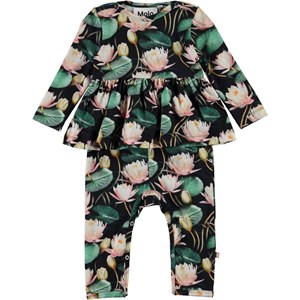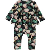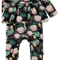 Florie is a long sleeve baby romper with long legs and a peplum skirt. It has a print of pink water lilies with green leaves. It has easy snap closure on the shoulders and the crotch.