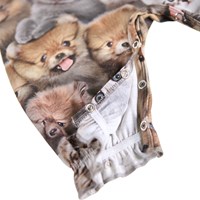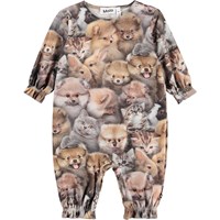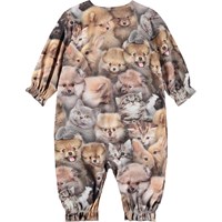 Jumpsuit for the little ones made of organic cotton with an animal print. The jumpsuit is loose and has long sleeves and legs. There is elastic at the wrists and ankles that adds a small ruffle edge. The button closure on one shoulder and between the legs makes it easy to get the jumpsuit on and off.