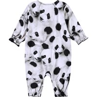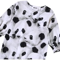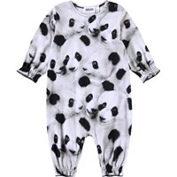 Jumpsuit for the little ones made from organic cotton. The jumpsuit is loose-fitting with long sleeves and legs. There is elastic at the wrists and ankles, adding a small ruffle edge. The button fastening on one shoulder and between the legs makes it easy to put on and take off. The jumpsuit features an all-over print of panda faces.