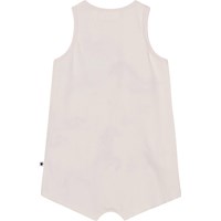 Off-white jersey baby romper with beautiful ruffle edge on the front and back. It is sleeveless and has short legs with elastic. The romper has an easy snap closure on the back and between the legs. The romper is comfortable, loose and airy and easy to move around in. The front of the romper has a festive print of colourful, fantastical carrousel animals