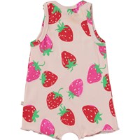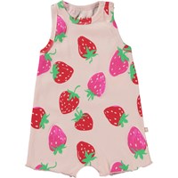 Floris is a pink baby romper in 100% cotton jersey. Floris is sleeveless and has an easy snap closure on one shoulder. It has short, wide legs and is in a strawberry print.