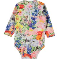 Fonda is a baby bodysuit with various animals hiding in the floral print. It has easy snap closure at the neck and crotch.