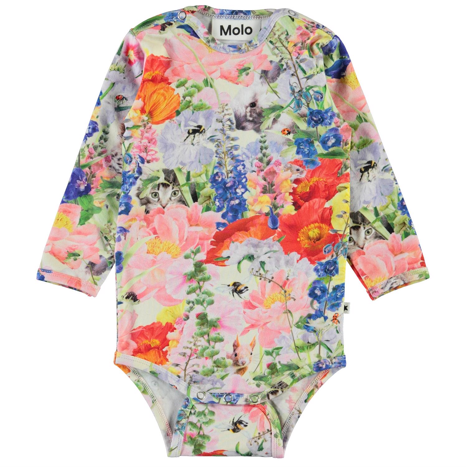 Fonda is a baby bodysuit with various animals hiding in the floral print. It has easy snap closure at the neck and crotch.