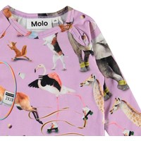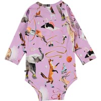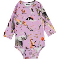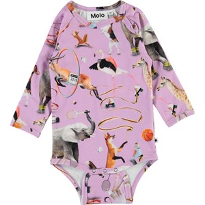 Fonda is a baby bodysuit with long sleeves in purple with a print of various animals engaged in sports. Fonda has easy snap closure at the collar and crotch.