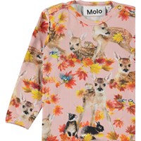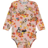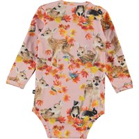 Foss is a long sleeve, baby bodysuit in pink with a print of deer, rabbits and golden leaves. It has easy snap closure at the neck and crotch.