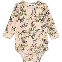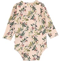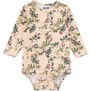 Foss is a rose coloured baby bodysuit with a print of blackberry vines. Foss has easy snap closure at the neck and between the legs.