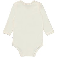 Foss is a beige baby bodysuit with a print of various animals, hugging each other. Foss has easy snap closure at the neck and between the legs.
