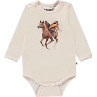Foss is a pink baby bodysuit with long sleeves in 100% organic cotton jersey. Foss has an easy snap closure at the neck and between the legs. An adorable, little foal with butterfly wings is printed on the stomach.