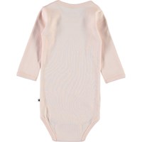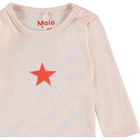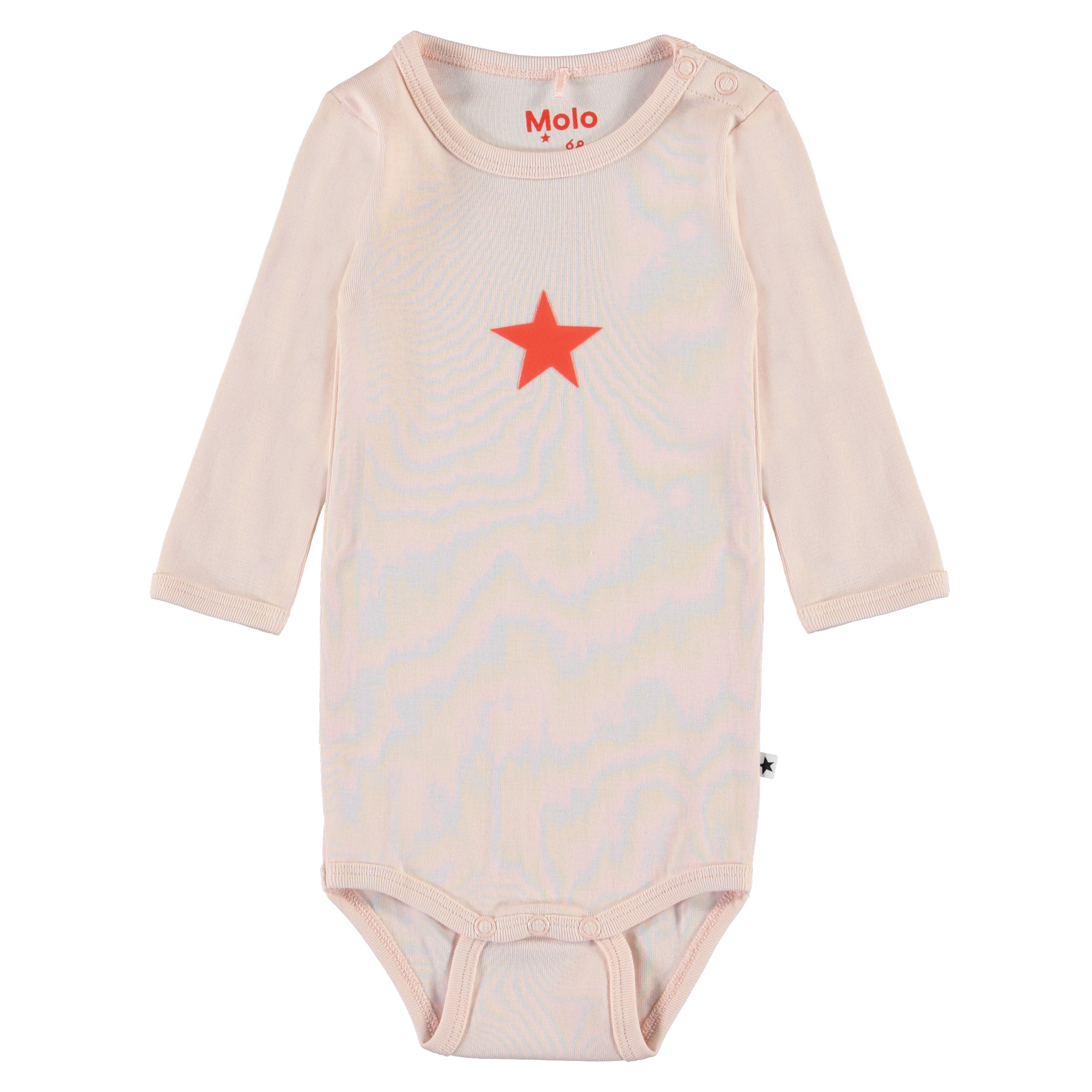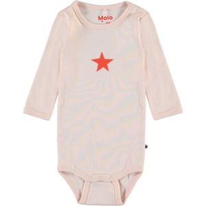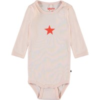 Foss is a long sleeve baby bodysuit in pink with a star on the front. It has easy snap closure at the neck and crotch.