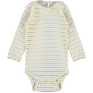 Foss is a long sleeve baby bodysuit with narrow yellow and rose stripes. It has easy snap closure at the neck and crotch.