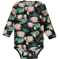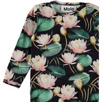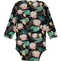 Foss is a long sleeve baby bodysuit with a print of pink water lilies. It has easy snap closure at the neck and crotch.