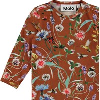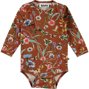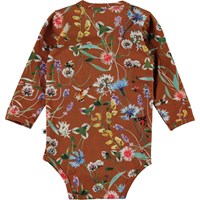 Foss is a long sleeve, baby bodysuit in brown with a print of wild flowers and small insects. It has easy snap closure at the neck and crotch.