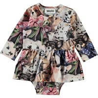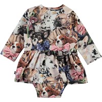 Frances is a long sleeve baby bodysuit with a print of small dogs. Frances has a peplum and easy snap closure at one shoulder and at the crotch.