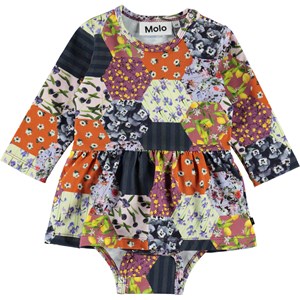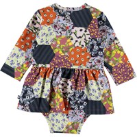 Frances is a long sleeve baby bodysuit with a patchwork print. Frances has a peplum and an easy snap closure at one shoulder and at the crotch.