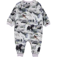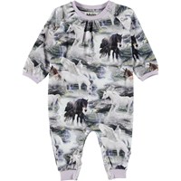 Francine is a baby romper in the 'Mythical Creatures' print with a light purple edge tape. Francine is roomy and is slightly draped at the neck. It has easy snap closure at the neck and crotch.