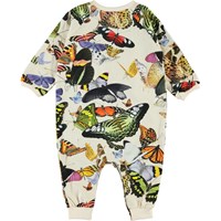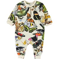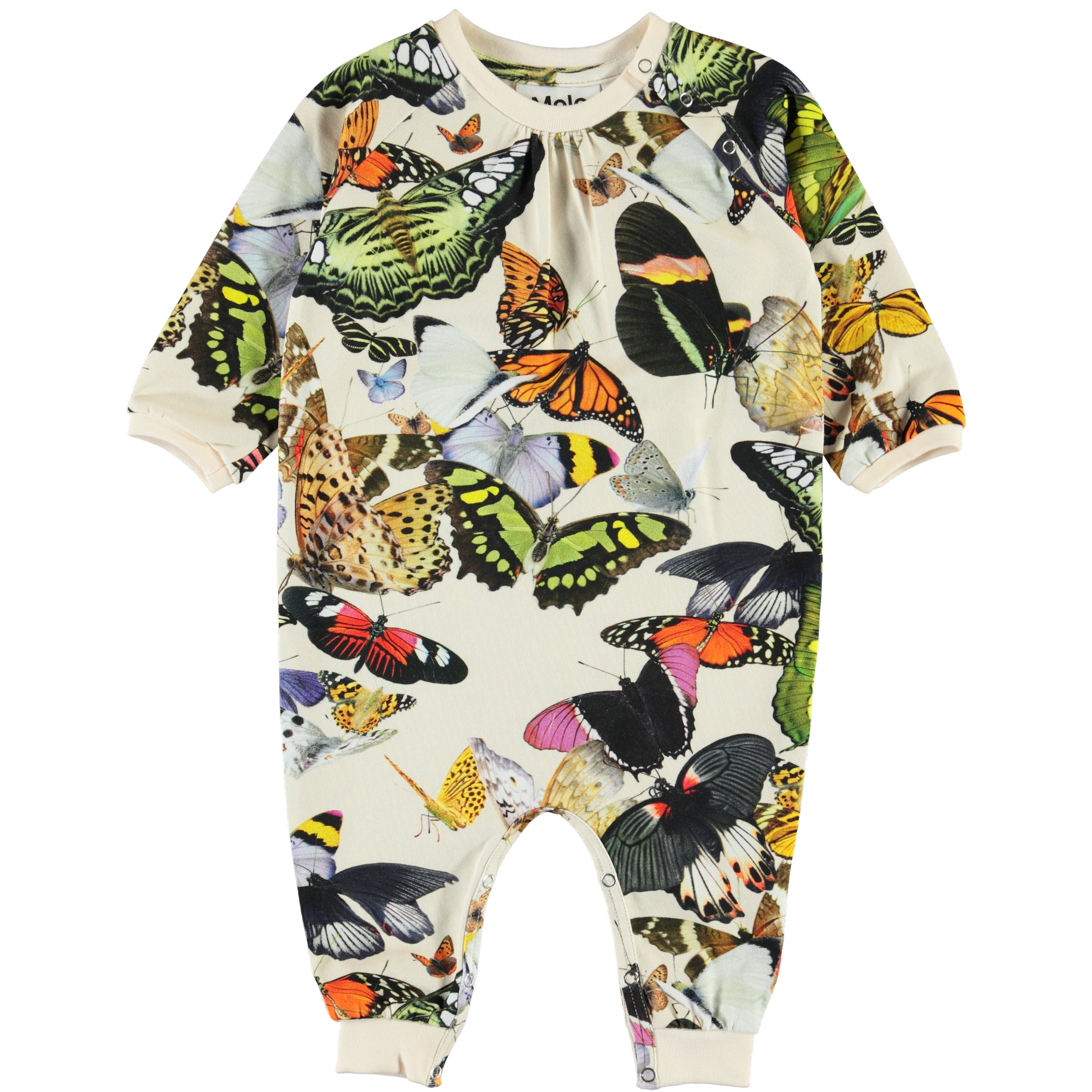 Francine is a baby romper with an all-over print of a colourful kaleidoscope of butterflies. Francine has a full shape and is slightly draped at the neck. It has an easy snap closure at the crotch.