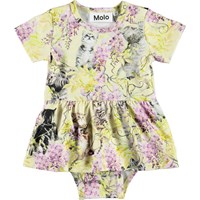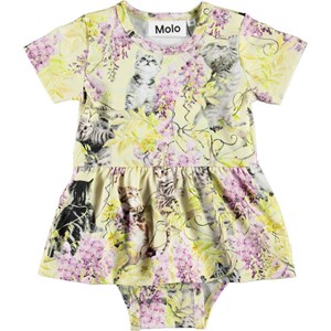 Frannie is a light yellow baby bodysuit with a print of kittens that are playing in wisteria. Frannie has short sleeves, a peplum and snaps at one shoulder and between the legs for quick changes.